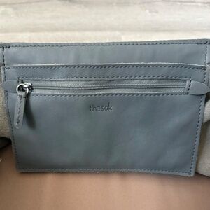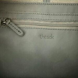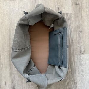 Stylish gray shoulder bag. Features brown handles. Perfect for everyday use.
