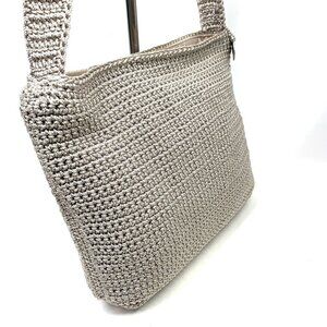 The Sak hand-crocheted crossbody bag is a small compact bag which lies flat to the body. It has an integral strap with a 15" drop and top zip closure which opens to beige fabric lining with one internal zip pocket. The exterior is crafted from hand-crochet, recycled polypropylene yarn in un-dyed natural eccru color, making this bag super cute and good for the environment. Excellent preowned condition with no visible flaws. See photos for details.
