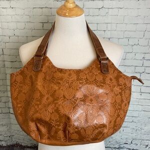 The Sak Indio Genuine Leather Satchel Caramel Brown Delicate Floral Embossing Boho Western Cowboy