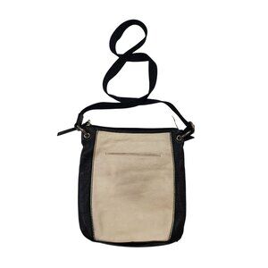 Really cute leather crossbody bag that has plenty of pockets - zip closure at the top, one zip pocket on the front, a snap closure pocket on the front and an open pocket on the back. Inside the lining has a cute print with a zip closure pocket and other open pockets.