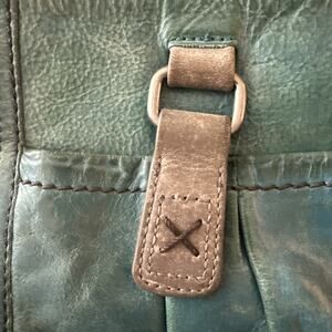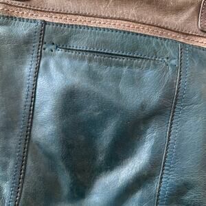 A stylish leather crossbody bag by The Sak, featuring a teal and brown color scheme with a buckle detail. The bag is lined with a patterned fabric and has a zippered pocket inside.