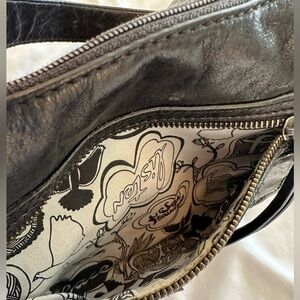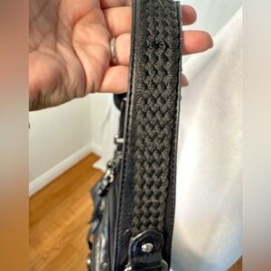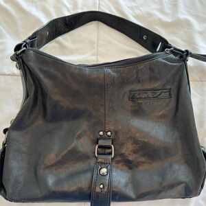 The Sak Leather Purse. Over the shoulder purse with zipper top, zippered pocket on the front and inside of bag, also 2 other inside pockets and one small pocket on the back. It is in good condition.