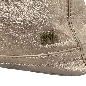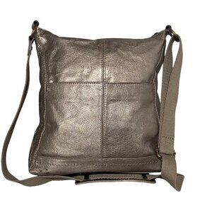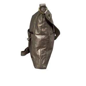 Cotton twill adjustable strap with leather shoulder piece, brass hardware, zipper closure, outside zipper pocket, inside zipper pocket, fabric lining