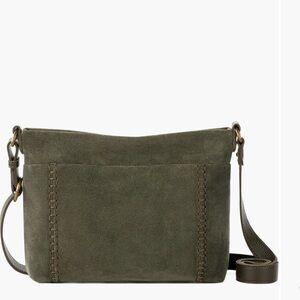 Stylish olive green suede crossbody bag by Fossil. Features a front zipper pocket and adjustable strap.