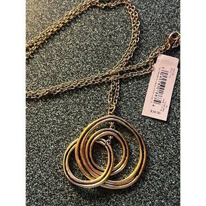 Elegant gold-tone pendant necklace featuring interlocking circles. An adjustable chain allows for versatile wearing lengths, ideal for sophisticated outfits.
