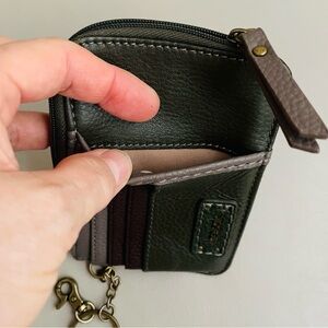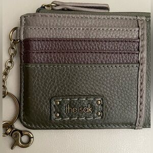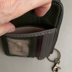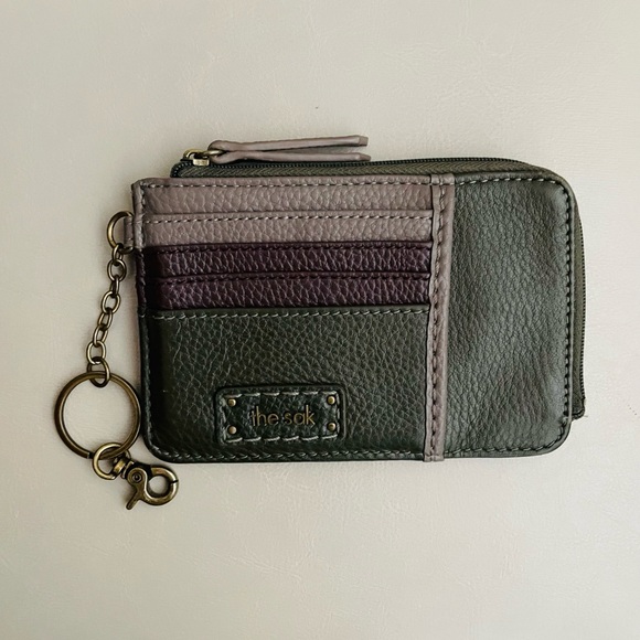 Stylish leather card holder with keychain. Features green, gray, and purple tones. Perfect for organizing cards and keys.