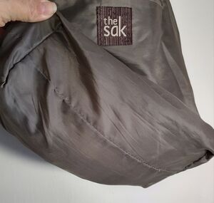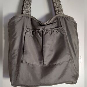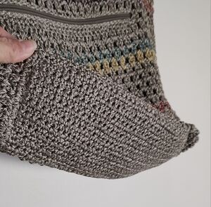Stylish taupe crochet tote bag featuring a blend of striped colors. Perfect for casual outings this Spring and Summer! Excellent pre-owned condition with no flaws noted. 14x12x4.5 with a 14" drop. This small tote bag has one outside zip pocket and an interior zip with two slip pockets.