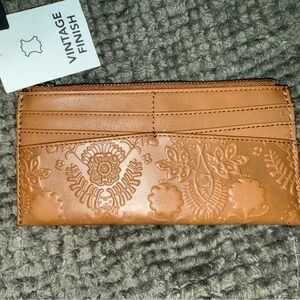 Elegant leather wallet by The Sak. Features embossed floral design. Ideal for essentials.