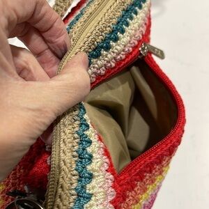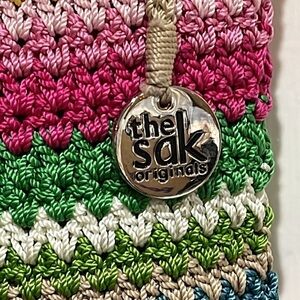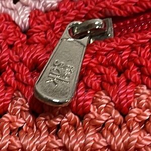 Beautiful brightly colored striped crochet bag. Zip closure with two interior zip pockets and one interior zip pocket. One exterior zipper pocket. No rips, stains, or tears found on interior or exterior fabric. Silver the Sak charm on zipper.