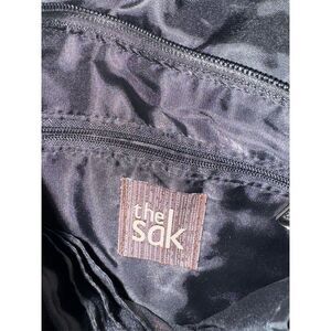 The Sak crossbody bag features a handcrafted crochet exterior in black, complemented by a fabric lining of the same color. Designed for women, this bag includes a zip closure and a shoulder strap for easy carrying. Suitable for casual outings or everyday use, it offers both style and functionality. The bag is pre-owned.
