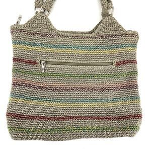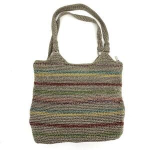 The Sak Woven Crochet Knit Fabric Striped Tote Purse Beige Earth Tones