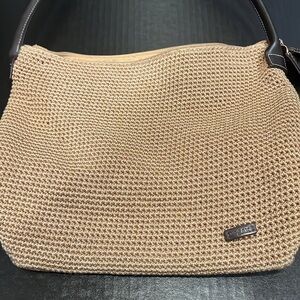 Classic The Sak woven style bag in light tan and dark brown. Leather handle and zipper, in great condition, noted only a few dots of white on strap—see pics. Medium size shoulder bag with nice weight to it.