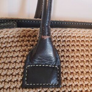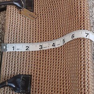 The Sak X Elliott Lucca Woven Nylon & Leather Trim Shoulder Bag. Cute little baguette with beige woven nylon exterior and dark brown leather trim. Rolled leather handles. Lined interior with zip pocket.