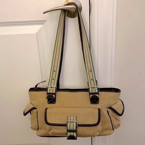 Woven beige satchel with blue and beige striped adjustable straps. Brown trim. Pink interior. Very good condition. One small pen mark.