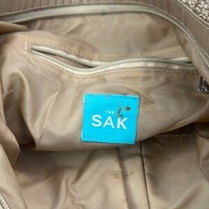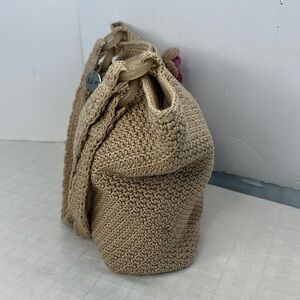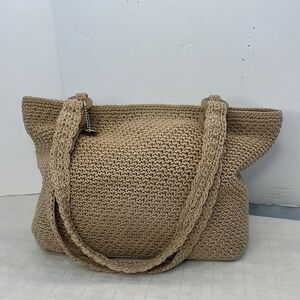 The Sak crochet Tan Tote Bag with Purple Flower Accent