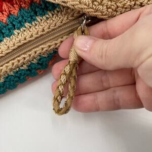 The zipper pulled and tassel (shown detached) are made from faux leather which has flaked. There is one stain on the inside bottom of the bag (see photos) - not visible externally. Crochet in excellent condition. All zippers tested and work great
