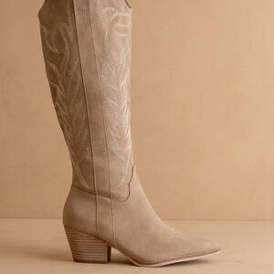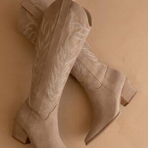 Step into timeless western-inspired style with these tall embroidered boots. Designed in a chic neutral taupe, they feature detailed tonal stitching, a pointed toe, and a stacked block heel that adds the perfect lift without sacrificing comfort. Versatile and effortlessly stylish, these boots pair beautifully with denim, dresses, or skirts, making them a must-have for fall wardrobes. Crafted with a soft faux suede finish, pull-on tabs, and a classic cowboy silhouette, they’re the perfect blend of modern elegance and rustic charm.