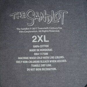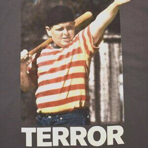 This is a men's 2XL charcoal T-shirt featuring Ham Porter from the movie "The Sandlot." The shirt has a crew neck and short sleeves, made of 100% cotton material. The design showcases Ham as "The Titan of Terror," pointing. Perfect for fans of the movie or baseball enthusiasts. item N38