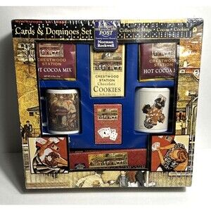The Saturday Evening Post Norman Rockwell Cards & Dominoes set includes 2 mugs.