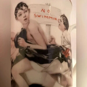 Copyright: 1921, Saturday Evening Post, Norman Rockwell porcelain “No swimming” picture cup. There is a small section of the gold rim that is missing, see picture. This debuted 102 years ago. Good, used condition.