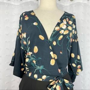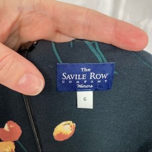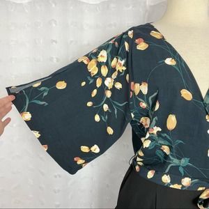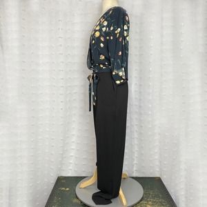 The Savile Row Company floral print jumpsuit. Wrap style top, 3/4 sleeve w/slit, tie @ waist (or add your own belt), pockets, taper style leg, zip back. Lovely yellow & orange tulip print across top. Lightweight black fabric on bottom (slightly see through). Back bodice shows some incontinuity in color. Marked a 6. Measures (flat, unstretched, approx): armpit - armpit: 18in, waist: 16in, hip: 21.5in, sleeve: 15in, shoulder to waist: 19in, rise: 13in, inseam: 30in, outseam: 42in, leg opening: 6in