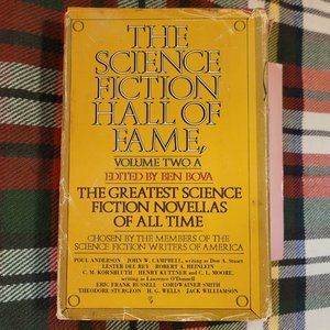 1973 hardcover edition of The Science Fiction Hall Of Fame, edited by Ben Bova. This copy has a broken spine (repairable by a librarian or book collector/restorer who knows what they are doing - and for this book, it is definitely worth doing). Otherwise, it displays wear consistent with shelf storage for a book its age (50 years). Good used copies get $39-$49. This one is going for $20 because it needs work. Worth restoring it though.