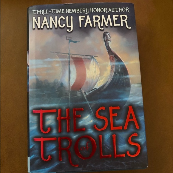 Hardcover edition of 'The Sea of Trolls' by Nancy Farmer. Features a striking cover with a Viking ship and bold red title.