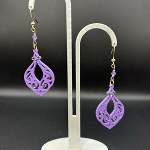 Elegant handmade earrings featuring intricate purple designs with gold accents. Perfect for adding a touch of sophistication to any outfit.