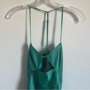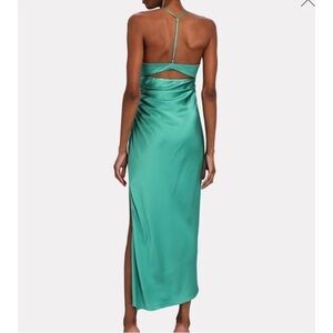 The Sei twists their midi along an ab-barring cut-out and thinly cut racerback in their signature silk charmeuse. Adjustable straps. Side zip closure