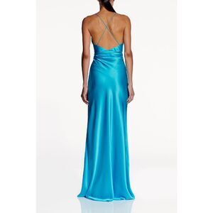 This flowing gown from The Sei is crafted of liquid silk in a draped wrap silhouette. An open back with delicate spaghetti straps and a thigh-high slit finish the look.