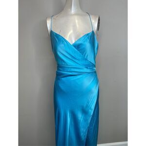 This flowing gown from The Sei is crafted of liquid silk in a draped wrap silhouette. An open back with delicate spaghetti straps and a thigh-high slit finish the look.