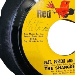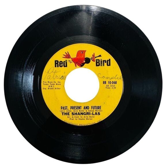 This is a pre-owned 7” vinyl single by The Shangri-Las, featuring the tracks Past, Present and Future and Paradise. Released by Red Bird, this vintage record plays at 45 RPM in stereo format and comes in a generic paper sleeve. Manufactured in the USA with catalog number RB 10-068, the record has scratches on both sides, a name written in pen on Side 1, and words in green marker on Side 2.