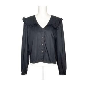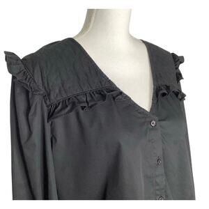 The Shirt Rochelle Behrens Black Button Down Ruffle Trim V-Neck Shirt Large