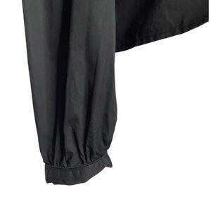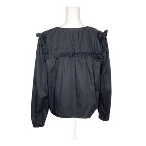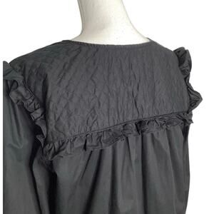 The Shirt Rochelle Behrens black button down shirt top, ruffle trim on front and back, quilted shoulder and back detail, banded cuffs