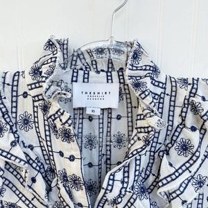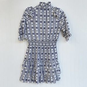 The Shirt Rochelle Behrens Dress Smock Ruffle Navy White Aztek Floral Mini