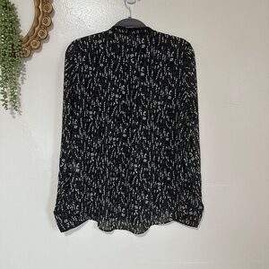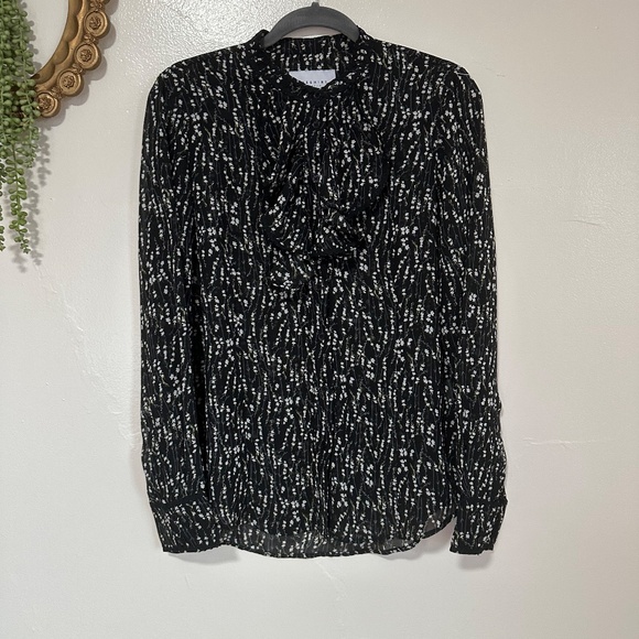 The Shirt by Rochelle Behrens in black with a white and sage green ditsy floral print. Buttons up the front with ruffle detail at the neck. Button cuff sleeves. Semi-sheer fabric.