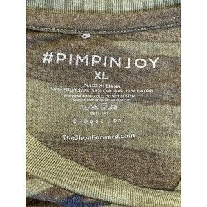 The Pimp In Joy Green Camo Short Sleeve Shirt in size XL is a stylish and trendy top for women. Made from rayon material, this square neck t-shirt features a colorful camouflage pattern in shades of green, making it a standout piece in any wardrobe. With a regular fit and no modifications, this shirt is perfect for those looking to add a pop of color and fashion-forward style to their collection.