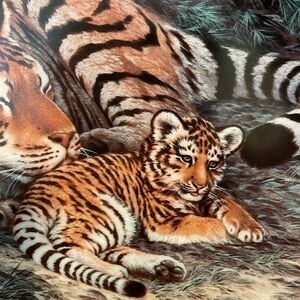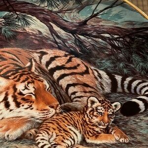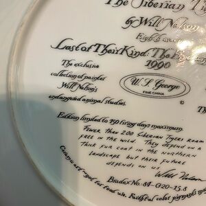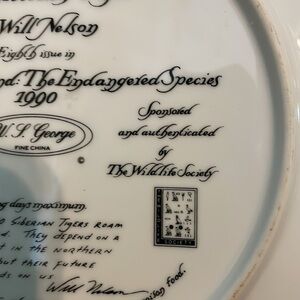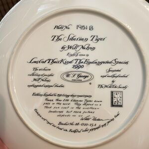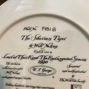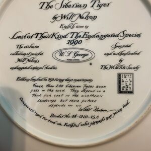 The Siberian Tiger Will Nelson Vintage Last of Their Kind: The Endangered Species Plate 1990. Eighth issue in series. Limited edition art painted plate. Gold edged. “Fewer than 200 Siberian tigers roam free in the world. They depend on a thick fur coat in the northern landscape but their future depends on us.” Sponsored and authenticated by The Wildlife Society. Very good preowned condition. May be slight discoloration on area that sits on table. These are not plates to eat off of, artwork only.