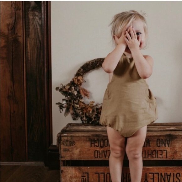 the simple folk linen overall romper in camel. 4/5 y 100% organic linen