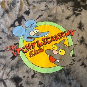 Color/Style: Black and gray tie-dye with bold, colorful “Itchy & Scratchy Show” graphic on the front.