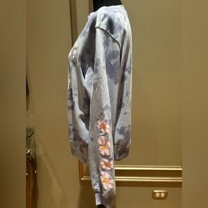 • Purple tie-dye pattern; floral graphics down sleeve