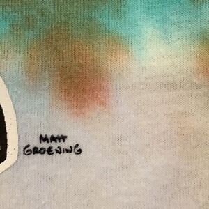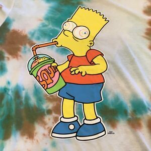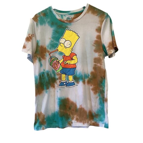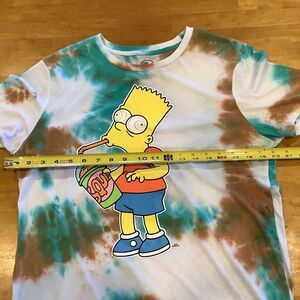This is a men's size medium t-shirt featuring Bart Simpson from The Simpsons. The shirt has a tie-dyed pattern in multi-colors, short sleeves, and a crew neck. It is made of 100% cotton and has a regular fit. The design is a graphic tee with a cartoon theme, perfect for fans of The Simpsons.