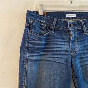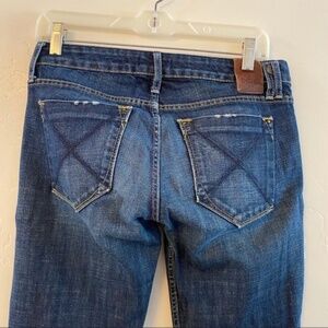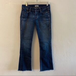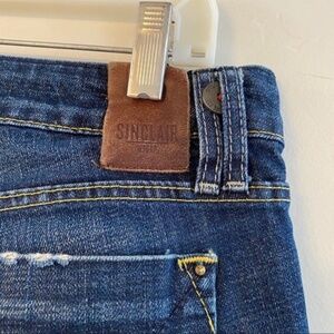 The Sinclair MFGRP. Size 4 (see measurements.) Dark wash raw hem straight leg jeans. Pockets in the front and back. Excellent used condition with no signs of wear. Waist: 14 inches. Rise: 11 inches. Inseam: 30 inches. ALL MEASUREMENTS ARE TAKEN WITH ITEM LAYING FLAT. ||4768||