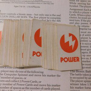 Game comes with 4 bases and markers, spinner, board and power cards. I counted 48 power cards, with some wear/creasing/spotting from use and age.