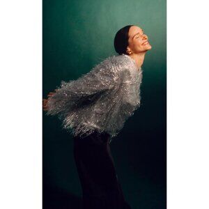 The Sleeper Women's Disco Fringed Metallic Jacket is the epitome of party-ready glamour. With its tinsel-inspired sparkle, this jacket transforms any look into a celebration. The oversized silhouette and classic crewneck create a relaxed fit that underscores the playful, yet sophisticated vibe. Long sleeves provide that slinky, cool-girl charm in a metallic finish that catches the light just right, infusing every move with a hint of sparkle and intrigue.