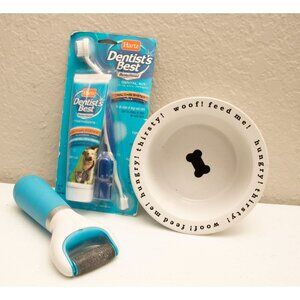 This is a lot of items for a small to medium size dog. 4 Sweaters A ceramic Dog Bowl , Grooming Instruments worth over 50 dollars. All items are in great pre-owned shape