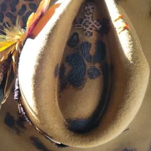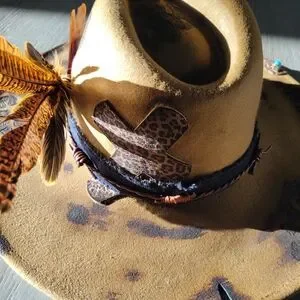 Make a bold statement with this authentic, hand burned, one of a kind rancher. With a distinctive distressed finish. The hat showcases a classic wide brim design with unique weathered detailing and rustic charm. Perfect for both casual wear and special occasions.