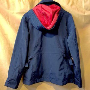 Port Authority. Absolutely excellent condition. Dark navy blue ladies' jacket, size Large. Softshell with buttoned-on hoody with cinch. Belts at sides of waist. 2 zippered side pockets. Meshy lining. Sporty and understated.