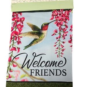 Charming garden flag with a hummingbird and pink flowers. Features 'Welcome Friends' text. Perfect for adding a friendly touch to your garden.