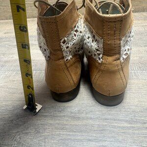 The Steve Madden Thundr-C Vintage Crocheted Lace Panels Ankle Boots in Women's Size 7.5 are stylish and versatile boots perfect for any casual outfit. Featuring a round toe, lace-up closure, and low block heel, these brown leather boots are adorned with unique crocheted lace panels for added flair. The leather lining and rubber outsole provide comfort and durability, making these ankle boots a must-have addition to any fashion-forward woman's wardrobe.